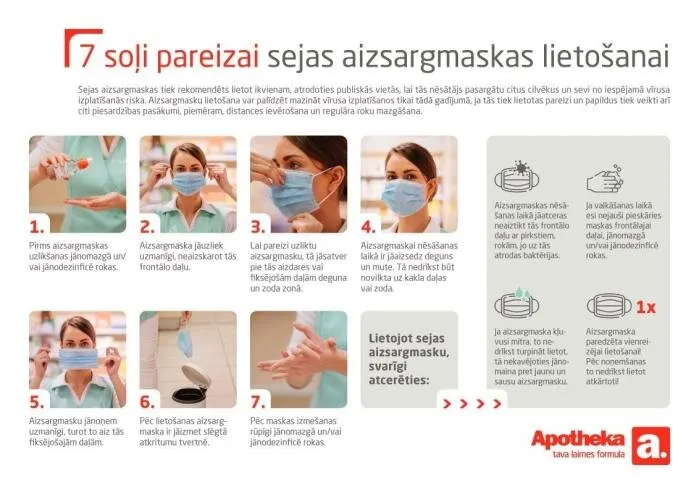 Kā skaidro Apotheka valdes loceklis Jānis Kūliņš, aizsargmaskas ir atgriezušās Apotheka aptieku plauktos, taču farmaceiti novērojuši, ka cilvēki mēdz iegādāties sejas aizsargmaskas, lai gan nav aizdomājušies par to pareizu lietošanu. Aizsargmasku pareiza lietošana nav sarežģīta, bet pašu drošībai svarīgi atcerēties vairākas būtiskas to lietošanas detaļas, piemēram, rūpīgu roku mazgāšanu vai dezinficēšanu pirms un pēc aizsargmaskas lietošanas, neaizskart maskas frontālo daļu, nelietot masku atkārtoti un citas nianses.