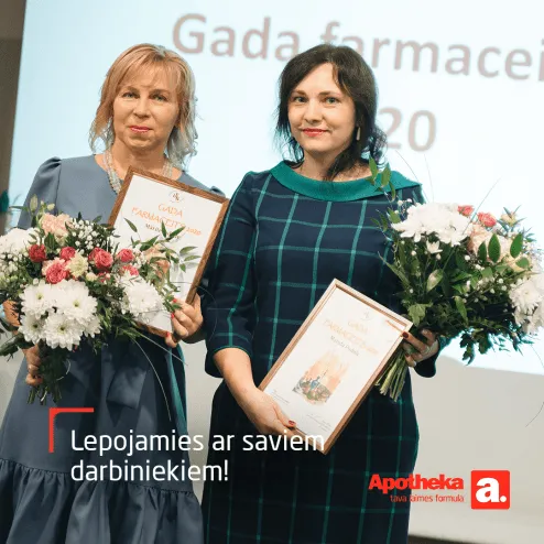Latvijas Farmaceitu biedrības ikgadējā nozares spēcīgāko speciālistu apbalvošanā Apotheka farmaceiti ieguvuši divus “Gada farmaceits 2020” titulus. Augsto novērtējumu saņēmušas sertificētās farmaceites Mārīte Šukele un Maruta Pudule, bet sertificētā farmaceite Elita Stūrmane – atzinības rakstu.