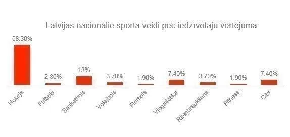 Ja Latvijas iedzīvotājiem liktu izvēlēties nacionālo sporta veidu, tad droši varētu teikt, ka vairāk nekā puse (58,3%) respondentu par tādu atzītu hokeju, secināts aptieku tīkla Apotheka aptaujā[1] par veselīgu dzīvesveidu un sportu. Par otru populārāko sporta veidu, kuru iedzīvotāji vērtē kā Latvijas nacionālo, tika atzīts basketbols (13%), bet trešo vietu ieņem vieglatlētika (7,4%).