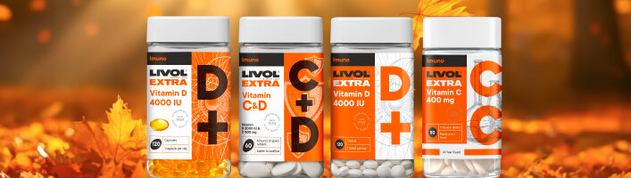 - Livol C+D Imunitāte – sinerģisks komplekss ar C un D vitamīnu, kas darbojas kā spēcīgs atbalsts imūnsistēmai, īpaši sezonu maiņās un stresa pilnos periodos. LIVOL EXTRA Vitamīni C & D – 500 mg C un 2000 IU D vitamīns vienā tabletē. Viens iepakojums diviem mēnešiem.