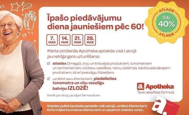 Martā katru otrdienu visās Apotheka aptiekās norisināsies senioru dienas, kur noteiktiem produktiem atlaides sasniegs līdz pat 40%.