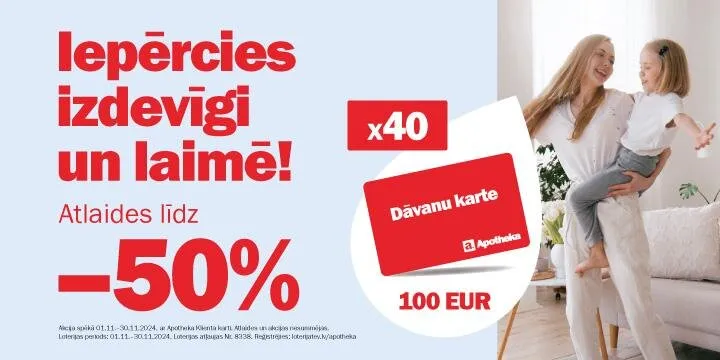 Piedāvājums spēkā ar Apotheka Klienta karti un apotheka.lv reģistrētajiem lietotājiem no 01.11.2024. līdz 30.11.2024. Atlaides un akcijas nesummējas. Apotheka patur tiesības mainīt piedāvājumu bez atsevišķa paziņojuma. Loterijā piedalās pirkumi vismaz 25 EUR vērtībā, čeka summā netiek iekļautas zāles, valsts kompensējamie medikamenti un ierīces, maisījumi zīdaiņiem līdz 6 mēnešu vecumam.